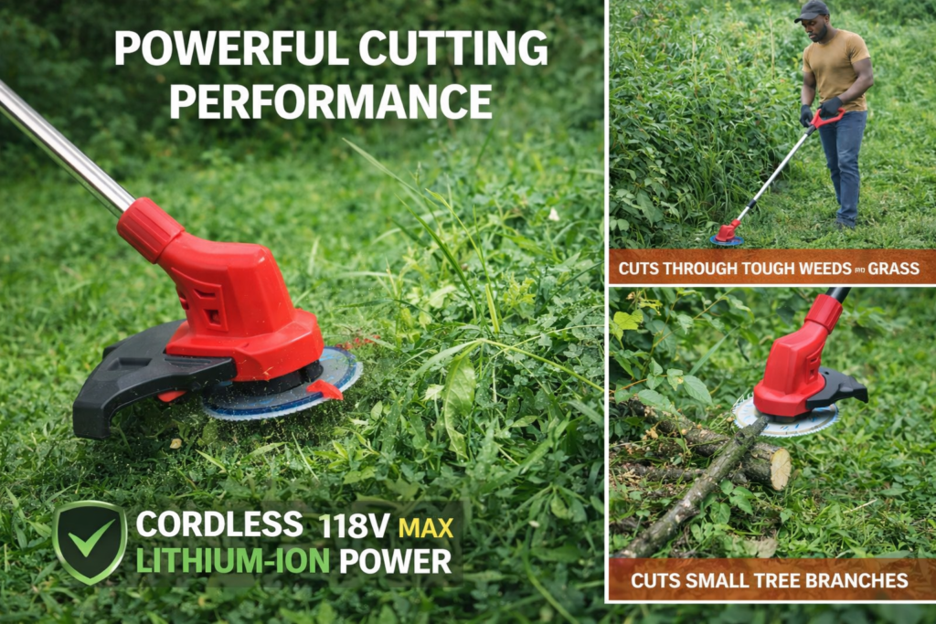 • Cuts through thick weeds, small branches, and overgrown areas with ease.